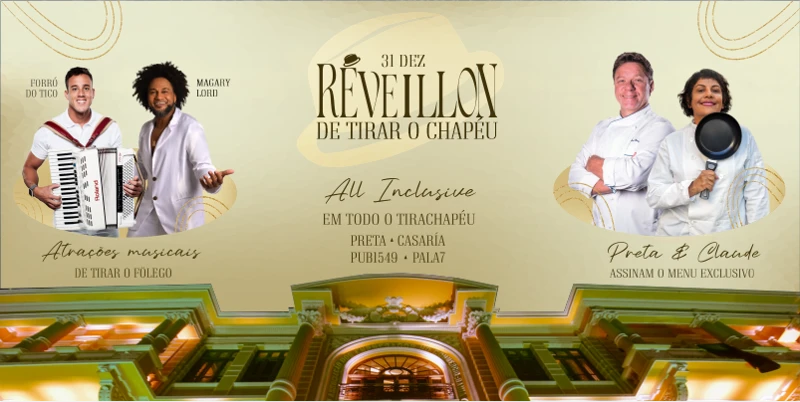 No dia 31 de dezembro, das 21h às 4h, o Palacete celebra a chegada de 2026 com serviço All Inclusive, menu de Claude Troisgros e Preta, atrações simultâneas e festa distribuída pelos salões, terraços e também pelo Piano Bar.