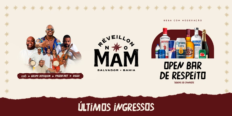 Camarote Open Bar: cerveja, água, refrigerante, energético, água tônica, vodka importada, gin importado e whisky importado. Na virada brinde com espumante.